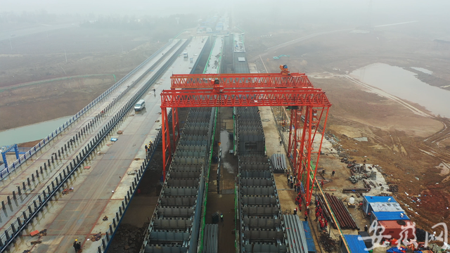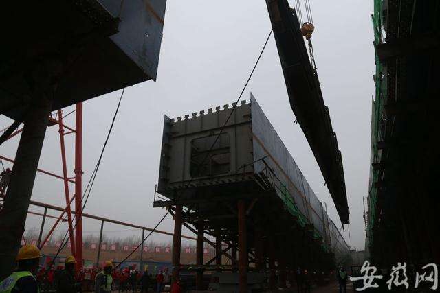 由于引江濟(jì)淮工程與G312合六葉公路相交,需新建一座公路橋跨越江淮運(yùn)河。記者在現(xiàn)場看到,大橋雛形已現(xiàn),工人們正在緊張施工?!癎312合六葉公路橋全長280米,總用鋼量達(dá)1.6萬噸,橋面總寬52.5米,最大跨度達(dá)180米、采用鋼箱梁結(jié)構(gòu),在同類鋼箱梁中主跨跨度居全國第二、安徽省第一?!敝需F五局引江濟(jì)淮項(xiàng)目負(fù)責(zé)人羅偉平介紹,鋼箱梁由四幅連續(xù)梁組成,每幅鋼箱梁采用100米+180米+100米的三跨結(jié)構(gòu)組成,其中3#、4#連續(xù)梁已于2020年4月份實(shí)現(xiàn)合龍。