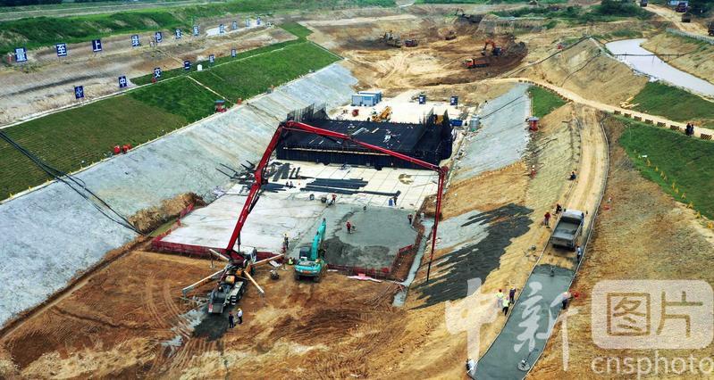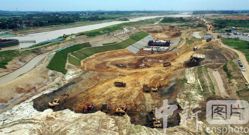 2020年8月7日,航拍引江濟淮工程安徽省合肥市廬江縣萬山鎮(zhèn)永橋村廬江船閘施工現(xiàn)場一片繁忙景象。