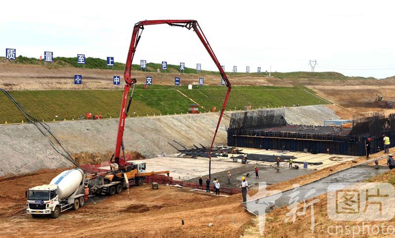 在引江濟淮工程安徽省合肥市廬江縣萬山鎮(zhèn)永橋村廬江船閘施工現(xiàn)場,中交第二航務工程局有限公司的建設(shè)者們正在施工廬江船閘閘室底板墊層混凝土澆筑。